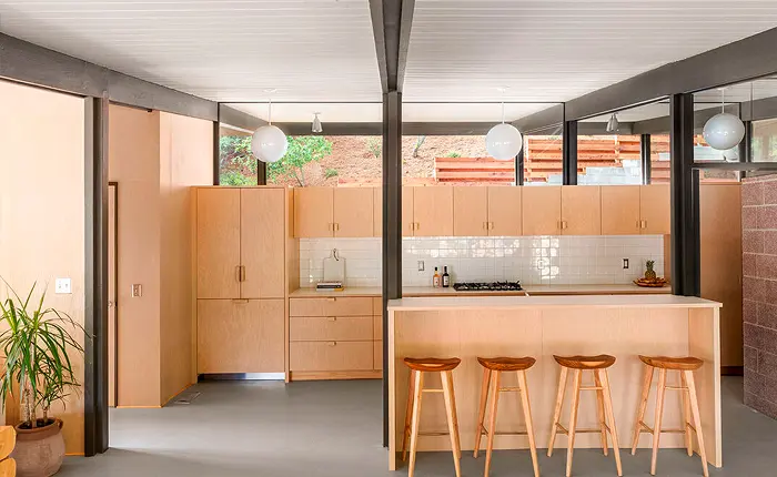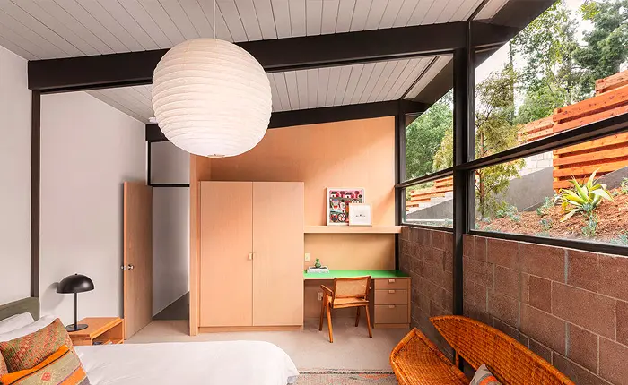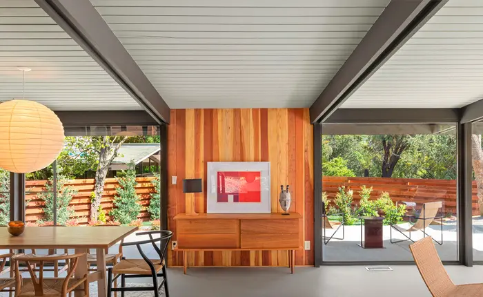 The meticulous restoration of the Hart Residence has ensured that this A. Quincy Jones home’s distinctive attributes have been preserved and brought back to their original glory. Among these is the striking sloping roofline with an integral carport, a feature distinct to this model and others in the tract. Inside, the Douglas fir plywood built-ins, a hallmark of this architectural style, have been carefully reconstructed, offering both aesthetic appeal and functional value.