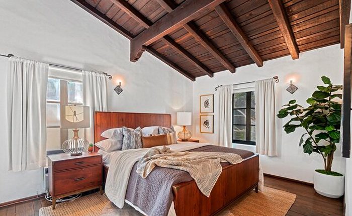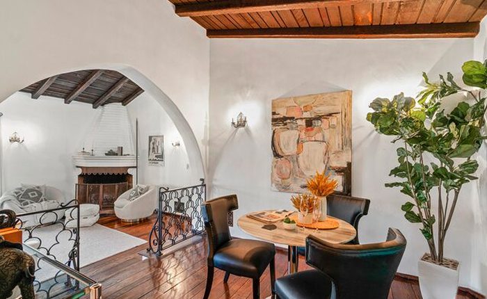 The Andalusia Historic West Hollywood condo, unit 8 is a stunning example of Spanish Revival architecture, listed on the National Register of Historic Places, the property offers significant property tax savings through the Mills Act. An elegant building, built by Arthur and Nina Zwebell in 1926, it has a celebrated history, once home to Jimi Hendrix, Marlon Brando, Caesar Romero and Jason Schwartzman among others. This upper unit boasts interior spaces flooded with natural light. The living room’s lofted wood beam ceilings and clerestory windows create a light and bright, yet old-world feel.