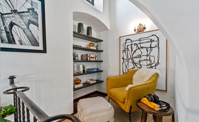 The elevated nook area makes the perfect alcove for reading or having a cup of tea. This stylish magical hideaway with recessed built-in bookshelves is the quintessential viewpoint for taking it all in.