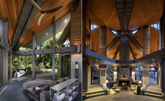 Grand steel beams, the wooden ceilings, and the wooden slat pillars all fall perfectly into place with the stone floors and centered fireplace to create a beautifully symmetrical grand layout that ultimately spotlights the intricacies of the overall design.