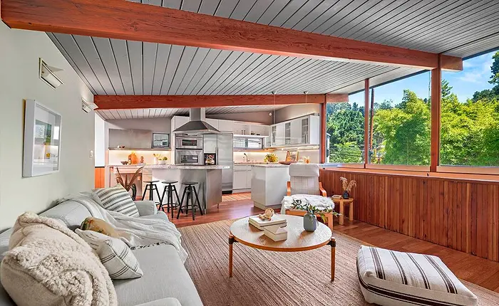 Inside, the open plan seamlessly guides you through each space in a quintessentially mid-century modern manner. The kitchen is equally striking, with clean lines and a muted color palette. Sleek marble countertops and stainless steel appliances combine to create a fresh and modern space. An oval-shaped island with seating for three adds to the room’s essential mid-century modern character.