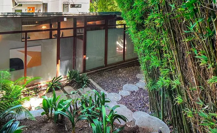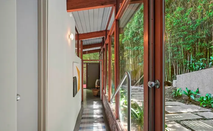 Just off the primary bedroom, a hallway with floor-to-ceiling glass overlooks a verdant garden of bamboo. It’s here, framed by the beauty of nature and enveloped in the spirit of mid-century modern design, where one can truly appreciate the home’s aspirational living aesthetic.