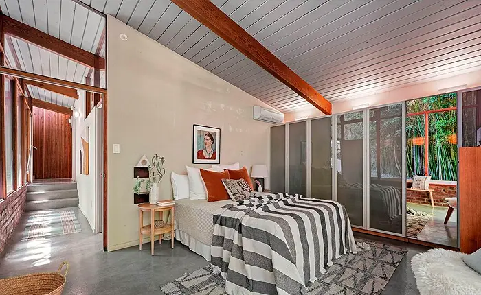 The primary bedroom opens to the garden filled with lush, mature greenery. This spacious room carries on the theme of timeless mid-century modern design with its Earth-toned furnishings, built-in cabinetry and walls of glass.