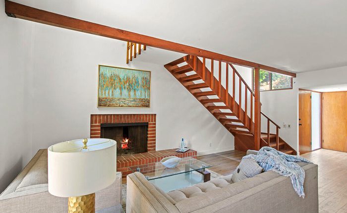 The wood-burning brick-lined fireplace is the focal point of the open living and dining area. It doesn’t get much better than relaxing in front of a roaring fire on a cool evening, in this mid century classic. The cork-clad dramatic stairway leads you up to the two bedrooms on the second floor.