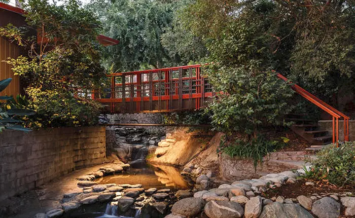 Expansive balconies, terracing, bridges and staircases extend the living experience outward, connecting the interiors to layered outdoor spaces. Entertaining decks, patios, cascading ponds, vegetable beds and a conversational firepit create noteworthy moments of gathering and reflection. The John Norton House demonstrates the Buff, Straub and Hensman Pasadena post and beam tradition of erasing boundaries between the indoor space and nature.