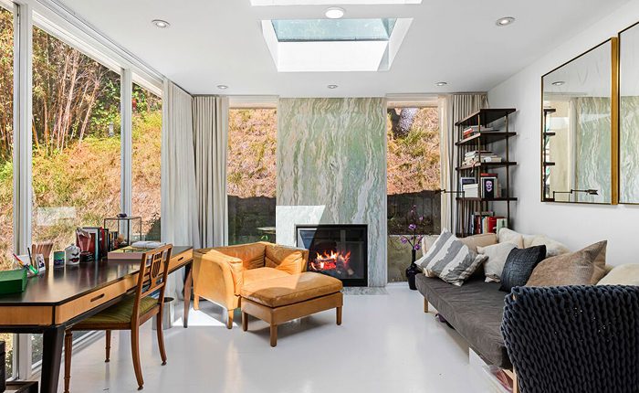 One of the highlights of the home is a stylish cantilevered glass box that seems to float above the yard and hillside. The space showcases a marble-clad fireplace and an expansive skylight and is designed for those who love to entertain or simply enjoy indoor/outdoor living.
