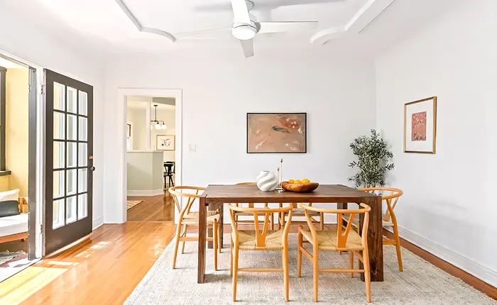 The vacant upstairs unit has been thoughtfully remodeled, blending contemporary updates with classic charm. Original wood flooring has been beautifully refinished throughout, while the refreshed kitchen showcases sleek quartz countertops, updated lighting and hardware, and a delightful breakfast nook that invites morning light.