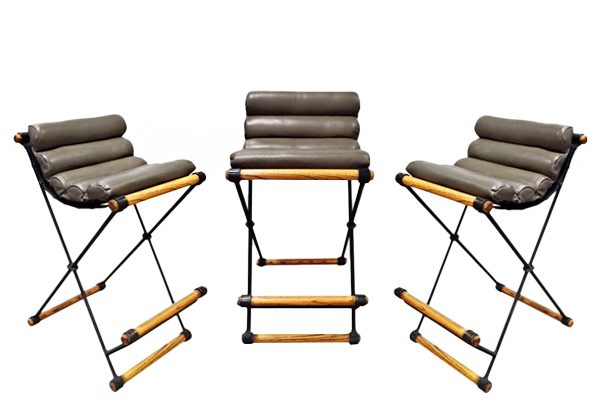 (Above) Campaign-style bar stools. Baldon’s classic “X-bar” model in oak and hand-forged iron, c. 1960s. A fantastic addition to stylish residential cocktail culture, both indoors and out.