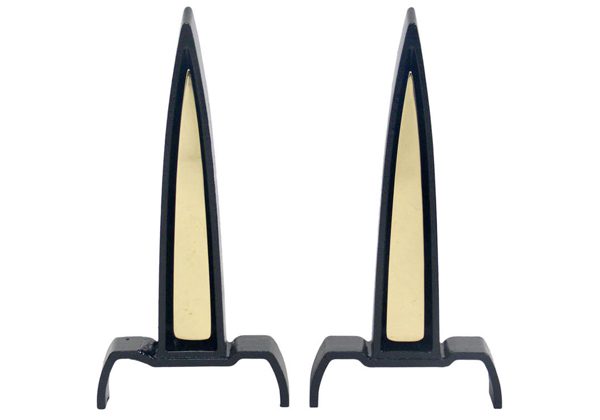 A statement pair of black and brass spire andirons for Bennett, crafted in iron and brass, c. 1950s.
