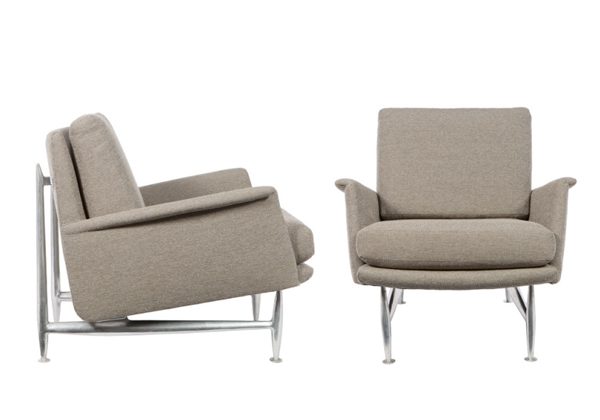 One of Deskey’s later designs, these modernist armchairs are crafted in aluminum with wool upholstery, c. 1960s.