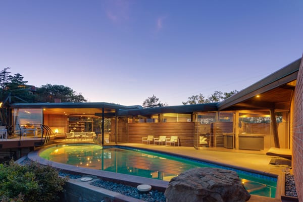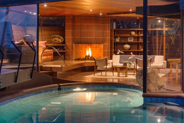 Lautner’s innovative use of a pool that cascades from the terrace into the living room, facilitated by a retractable glass wall, is particularly striking. This seamless transition enhances the visual connection to nature and creates an immersive experience. The famous hydraulic swing-out wall serves as an example of John Lautner‘s bold design approach, erasing the boundaries between indoors and out, and allows the environment to effortlessly intertwine with the comforts of home. Some sources link this hydraulic wall to the Hawaiian concept of “hikea,” or a “platform of gatherings.”