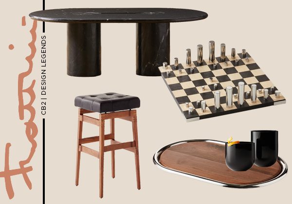 A selection of Frattin’s reissued pieces by CB2 as part of its Design Legends Series. An oval black marble Coffee Table, a black leather Bar Stool, a stainless steel Chess Set, an oval stainless steel and walnut Serving Tray and a single/double Old Fashioned Glass.