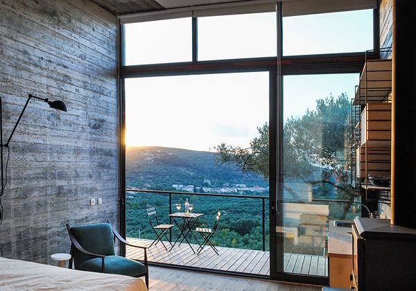 Sited perfectly on the hillside, with their glass facing facades and set amongst hundreds of lush olive trees these cabins seem to come alive at sunset.