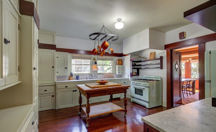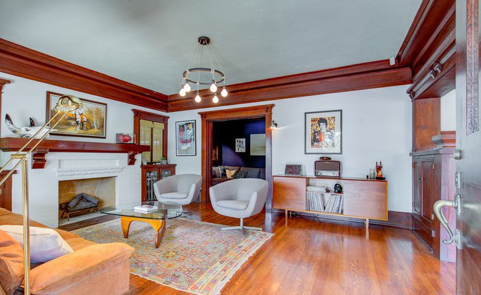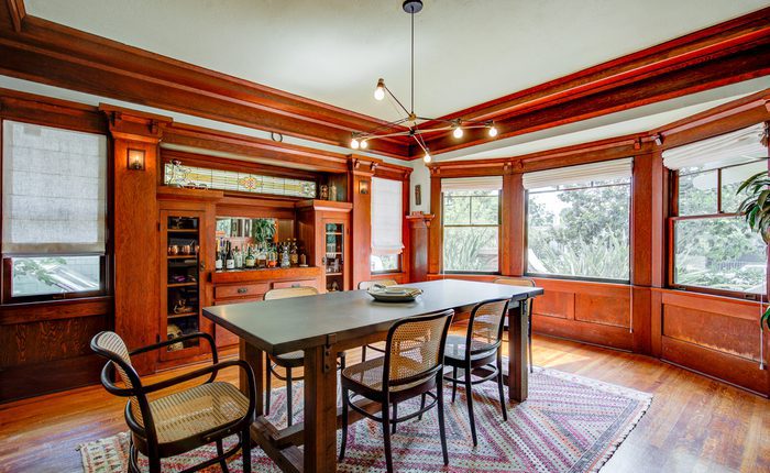 The living room is bookended by a perfectly cozy den and formal dining room with original built-in bar.