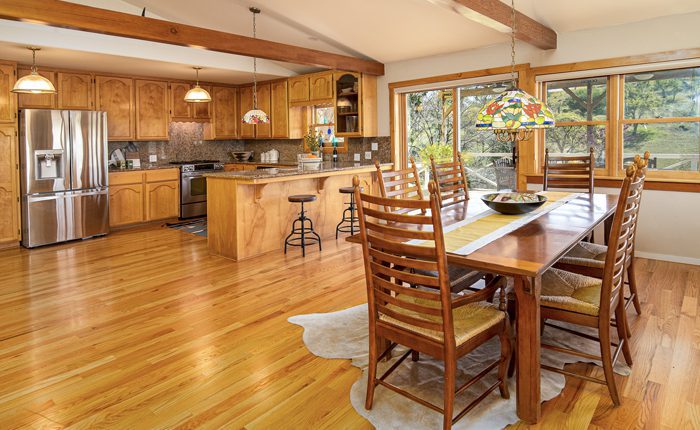 Highlighted by a wall of windows, the living room’s view takes full advantage of the incredible scenery. Enjoy evenings around the stone-clad fireplace. You may even see a flock of wild turkeys making their way up the hillside, feathered plumage on full display.