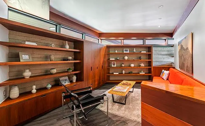 Step into the cozy library with a built-in sofa and walls clad with built-in bookshelves, ideal for showcasing a ceramics collection. This private space offers the perfect opportunity to escape into a great book or movie. Soft natural light filters through the clerestory windows, creating a serene space of peace and tranquility.