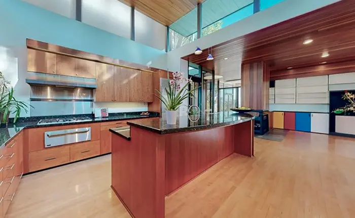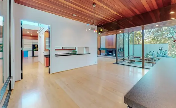 If you’re looking for a unique and tranquil retreat, this 1973 La Canada Mid Century Modern estate inspired by noted modern architect Ray Kappe is the perfect place for you. The two acre property beautifully utilizes the surrounding natural elements to create an unrivaled sense of privacy and serenity in a lush estate environment. Indoors, you’ll find an open floor plan with plenty of natural light, while outdoors you can enjoy a private pool, spa, and picturesque gardens. The walkway through the water is not to be missed.