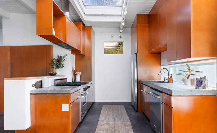 Tucked away on a quiet street, this Laurel Canyon artist retreat is the perfect place to get away from it all and enjoy the California sunshine. The home’s loft-like vaulted ceilings and skylights provide ample natural light creating a bright, airy feel throughout.