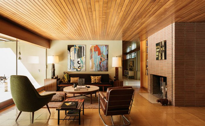 Neutra’s classic continuous steel-framed ribbon windows surround the living room in an aspirational and functional way. The wood-burning brick fireplace is the room’s centerpiece, and the oval-shaped dining room table emphasizes the relationship between the home and the exterior as it juts out into the landscape.