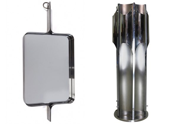 Boyer gave the same attention to the decorative arts as his interiors and furniture. This rectangular brushed steel mirror is elegant and modern at the same time, steel being one of Boyers favorite materials, c. 1970s. The “Organ Pipe” floor or table lamp is a dichotomy of simplicity and complexity, constructed of chromed metal, c. 1960s.
