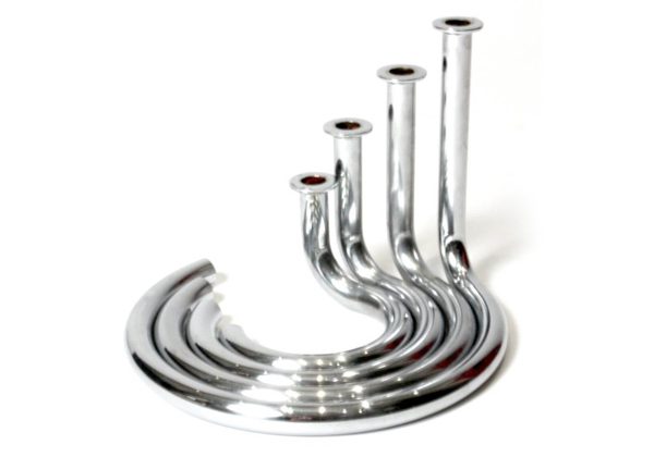 This candlestick holder consists of four independent interlocking chrome plated tubes which “hug” each other to create an interesting composite, c. 1972.