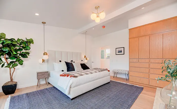 The residence seamlessly blends original mid-century charm with a modern updated twist. The open-plan living room, kitchen, and family room celebrate the floor plan that makes a mid century home famous. These flowing spaces, laced with iconic design touches, classic wood cabinetry, and modern updates, open to the expansive outdoor areas. Outside is where the property’s real showstopper comes into play – the awe-inspiring, panoramic views of the Hollywood Hills, Universal City and beyond.