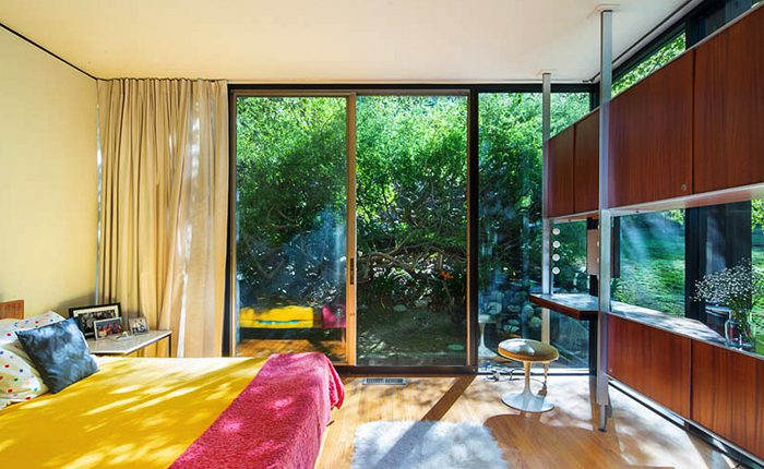 Craig Ellwood was known for his detailed minimalist buildings and larger-than-life personality. While many of the architects’ projects utilized steel construction, Ellwood chose to utilize wood on this project to meet budgetary requirements. The glass-walled box boasts classic post and beam construction while providing a uniquely visceral experience. The horizontal oriented pavilion-style residence rises out of a grove of grand old eucalyptus trees. The lush verdant landscape provides both shade and privacy for the property. A classic mid century design incorporating storage and a functional fireplace becomes the focal point for the living room.