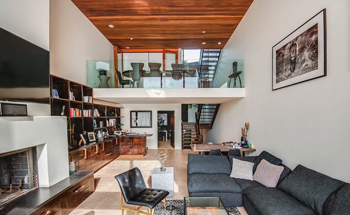 The main living room showcases a loft that overlooks a double-height living space with floor-to-ceiling glass and stunning ocean views. A focal point fireplace makes the perfect retreat on cool evenings and built-in bookcases and cabinetry offer ample storage without intruding on the space’s original design intent.