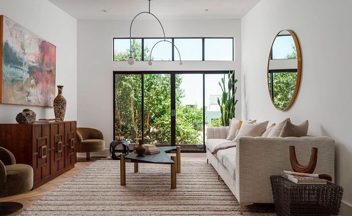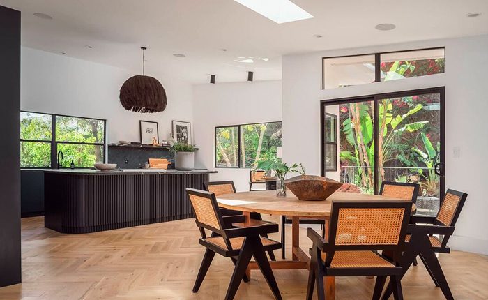 The home’s open floor plan features a large sunken living room with original terrazzo floors transforming you into the “Mad Men” era updated with luxe modern styling. Herringbone patterned wood floors create a warm and welcoming atmosphere, while the triangular railing detail is a modern take on a classic design.