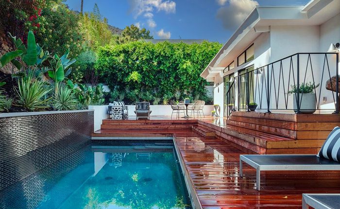 Outside, the yard boasts a sparkling pool with lush landscaping. Entertaining and meals alfresco can be enjoyed on the multi-level deck of this remodeled Sunset Strip mid century home set on one of the area’s most desirable streets. The perfect opportunity to own a home in a neighborhood with prices above $10M.