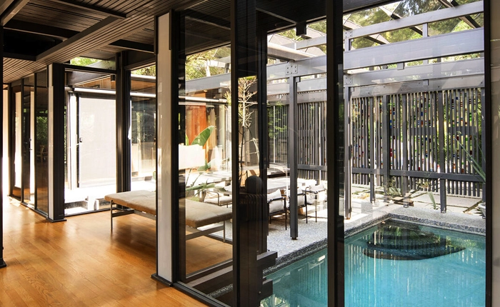Expertly reimagined while preserving its authentic integrity, the luxurious residence has been meticulously restored to meet modern standards. The iconic pool flows beneath one wing of the home through a dramatic indoor passage. This design element stands as a hallmark of innovation rarely seen in residential design. Inside, custom light boxes heighten the mood, allowing the interiors to glow like a perfectly cut jewel.