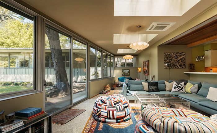 Neutra infused the home with classic mid-century features like, dramatic angles, aluminum casement windows, covered terrazzo terraces and enormous walls of glass that open to combine the indoors with the outside.