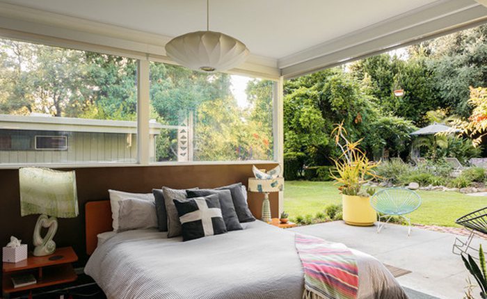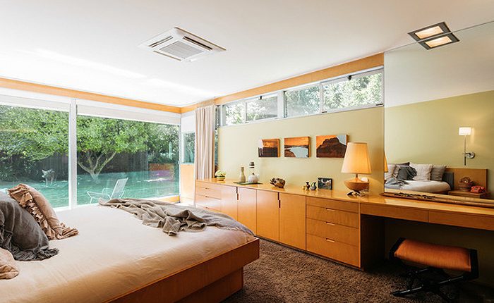 The owners hired architect John Bertram to methodically restore the property to Neutra’s original plan for the home. Showcasing beatufiful built-in cabintery in the master suite.