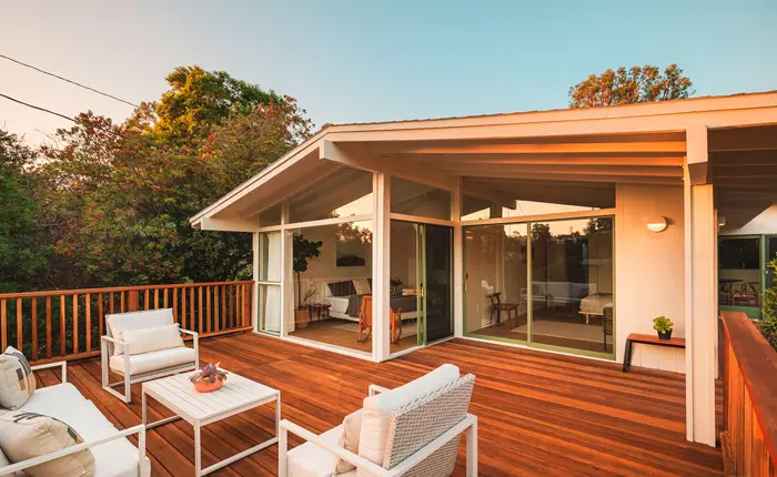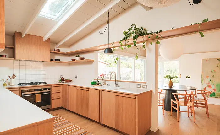 The integration of modern updates around the home’s original structure not only breathes new life into the residence but also preserves its design integrity. A distinctive front facade is established by a post and beam trellis, providing a shaded area at the entrance.
