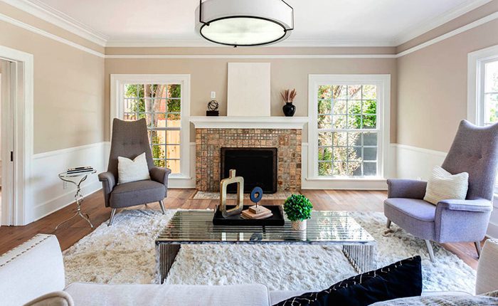 The light-filled living room features a focal point Batchelder style fireplace, high ceilings, crown moldings, original windows and doors and wide plank flooring. The open-plan living layout highlights the ease of movement between the den, dining room and kitchen, ideal for entertaining.