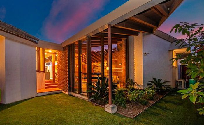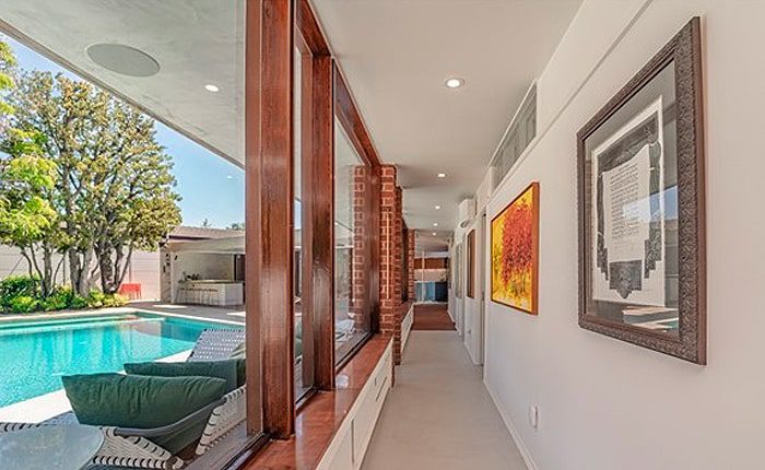A glass-walled walkway makes moving through the house experiential, with views of the sparkling saline pool, mature landscaping and outdoor entertaining area. Here again, John Lautner displays his passion for opening up walls and connecting the residence to nature.