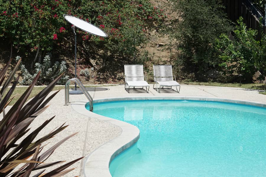 A recently built, glistening, kidney-shaped pool completes the perfect modernist atmosphere. The perfect place to laze away a summer day.