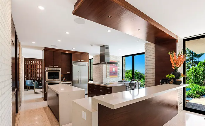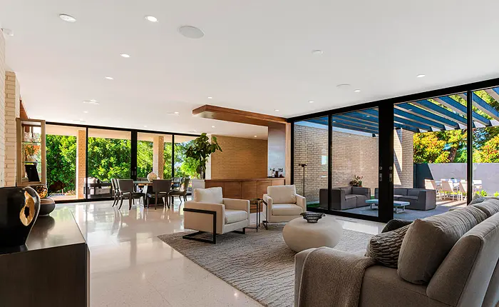 Completely remodeled and beautifully finished the modernist estate features the finest materials, stunning architecture and breathtaking canyon views. The one-story open floor plan features custom carved doors and a dramatic Terrazzo-covered entry that leads to an expansive formal living room, dining room with African mahogany display cases, and gourmet kitchen.