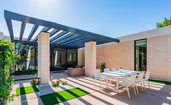 The stunning property sits on over an acre of perfectly landscaped grounds, providing the epitome of architectural presence and privacy. The modernist garden setting offers a solar-heated custom pool and is complemented by beautiful drought-tolerant plants along with several sitting areas throughout the property.