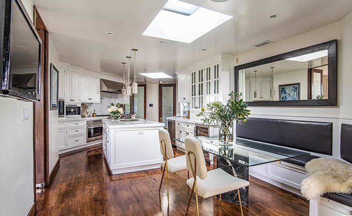 This modern home features an eat in chef’s kitchen with custom cabinets, marble countertops and high-end appliances. The formal dining room is just off the kitchen.