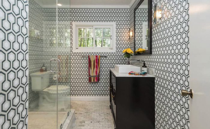 The stunning primary bathroom is picture perfect and features Carrara marble, a geometric interior, and tiled flooring.