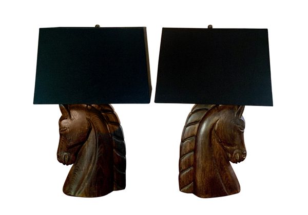 Be Bold! This pair of William Haines carved horse head lamps will be a conversation starter in any Modern or Hollywood Regency style home. The stately pair of equestrians in a dark cerused oak finish, are highlighted by a pair of gold foil-lined silk shades, creating a warm ambient glow.