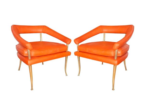 Spectacular pair of brass and orange leather armchairs highlighting Haines’ unique ability to create show-stopping furniture that was low in profile, sculptural yet still beautiful and functional, c. 1955.