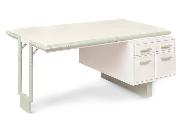 A fine example of Haines’ flair for the unexpected. The Bamboo Desk was originally created for his best friend Betsy Bloomingdale in 1959. The white leather desk is highlighted by the wrap-around faux bamboo detailing and is again available through williamhaines.com.