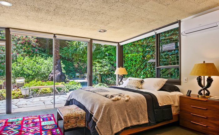 A staple of John Lautner’s work, walls of glass continue into the primary bedroom, creating a seamless connection between the indoors and outdoors. The private space becomes a peaceful retreat, perfectly choreographed by the architect. The integration of mid-century principles is evident here, as the design blurs the lines between the living space and the surrounding landscape.